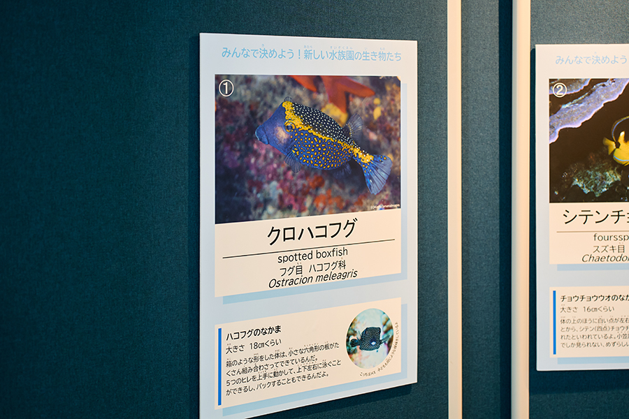 それぞれの投票で1位に選ばれたクロハコフグとハタタテダイを、新水族園の「小笠原諸島」をテーマにした水槽で展示する予定です。