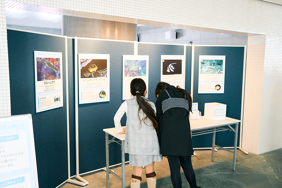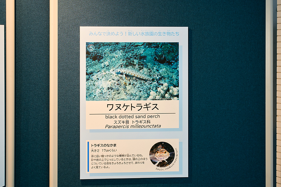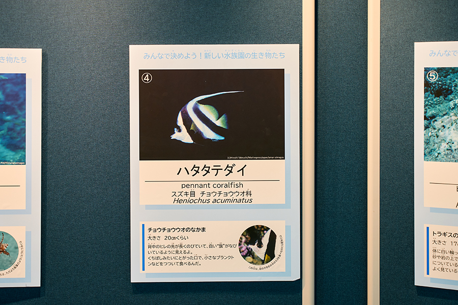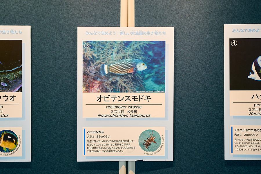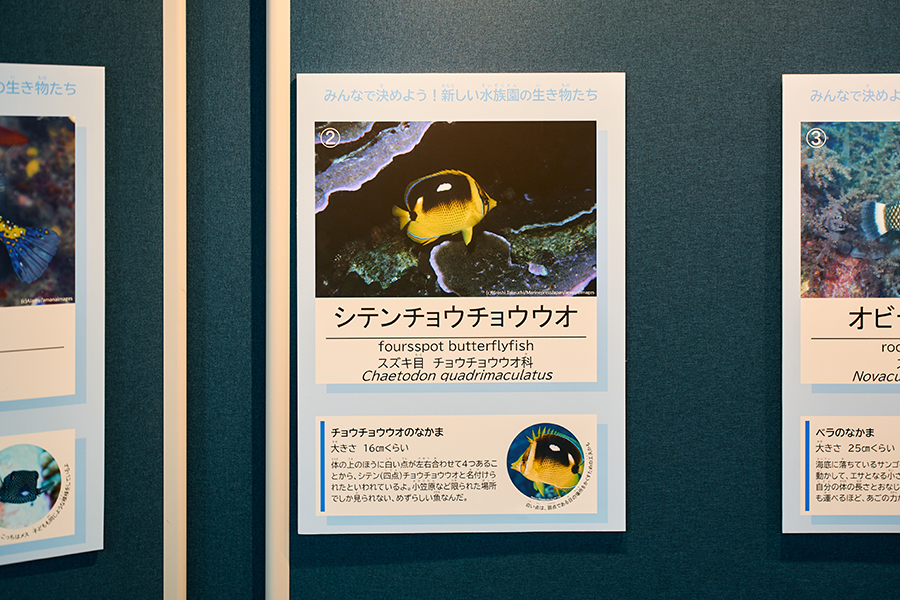 イベント期間中は、葛西臨海水族園の「東京の海」エリアにある「小笠原の海4」水槽の脇にスペースを設け、5種の魚を紹介するパネルを展示しました。パネルでは、それぞれの魚の写真のほか、色や形、エサの食べ方、泳ぎ方といった特徴についても解説しています。参加者は、このパネルを参考に、新水族園で見てみたい魚を1種選んで投票しました。