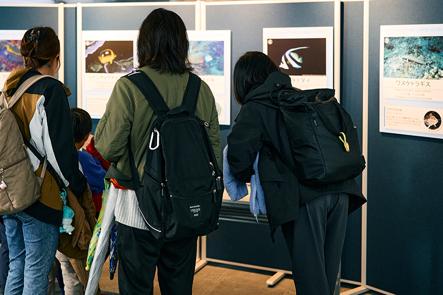 会場には、こどもや家族連れ、学生グループなど多くの方々が訪れ、興味深そうにパネルに見入っていました。こどもたちからは「この魚は色がキレイだけど、こっちの魚もかっこよくて迷う」「どの魚もかわいいね」といった声も。パッと第一印象で選んだり、パネルの解説を一つずつじっくり読み込んだりと、楽しみながらも真剣に選んでいる様子が見られました。パネルの解説を読み、「小さなプランクトンを食べるには、こんな口の形が便利なんだね」などと、家族で話し合う姿もありました。