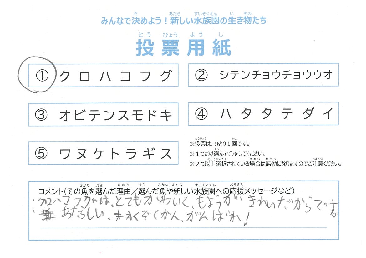 「今ちょうどこどもが魚にハマっていて、親子で楽しく投票しました。新しい水族館のオープンを今からとても楽しみにしています。どの魚が1位になるかも楽しみです」
